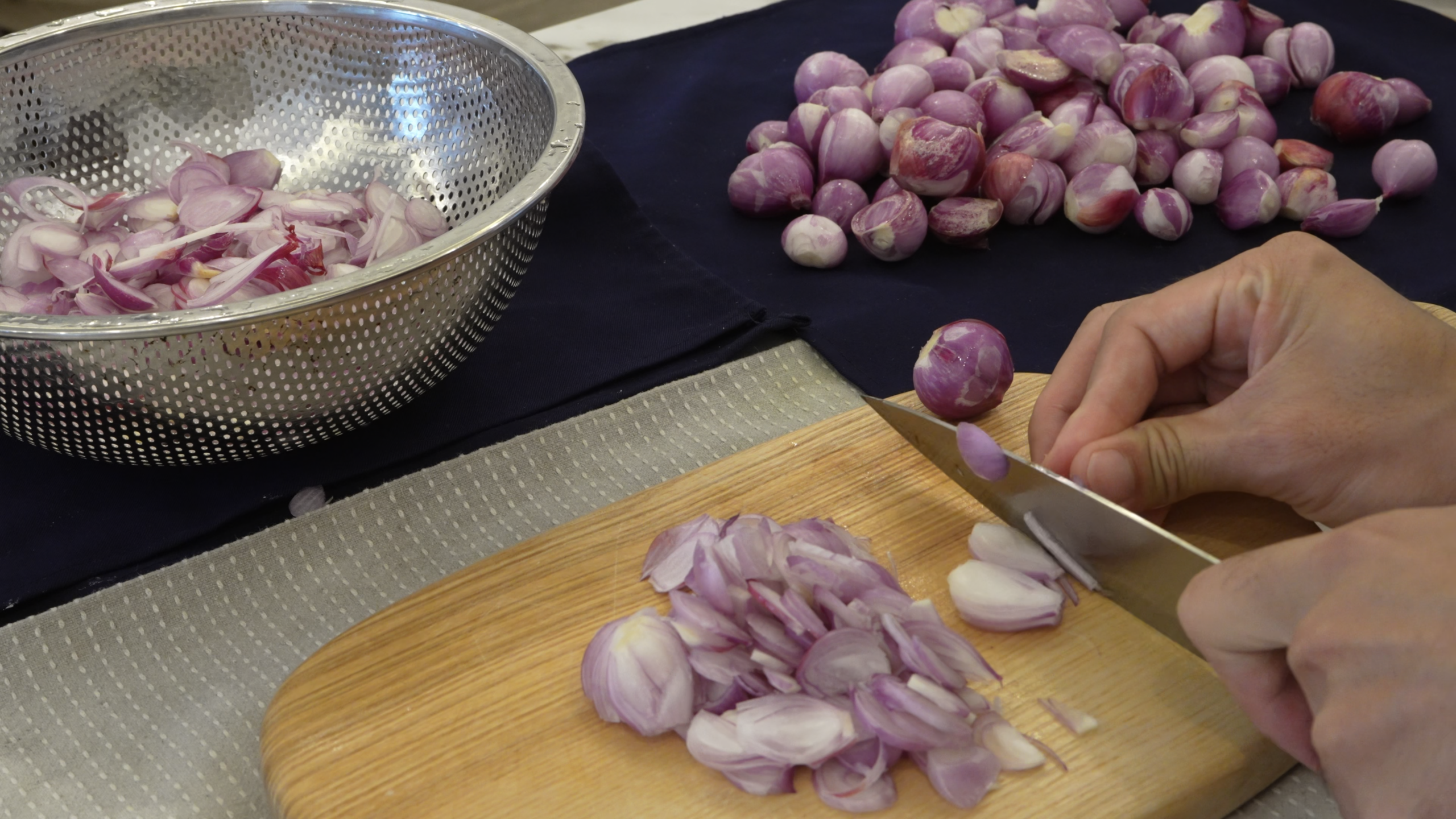 Thinly sliced shallots, fried slowly in hot oil.