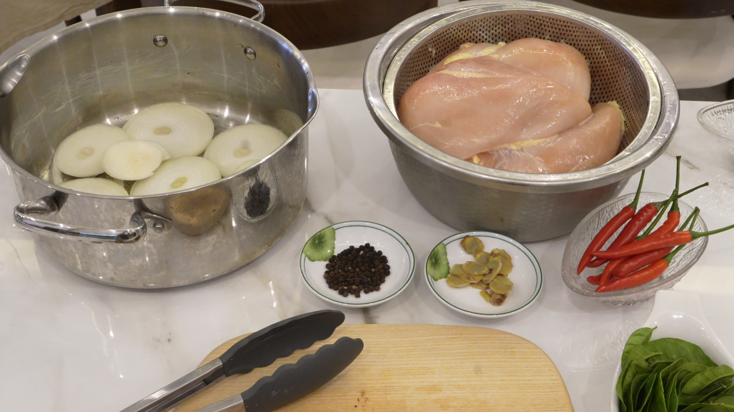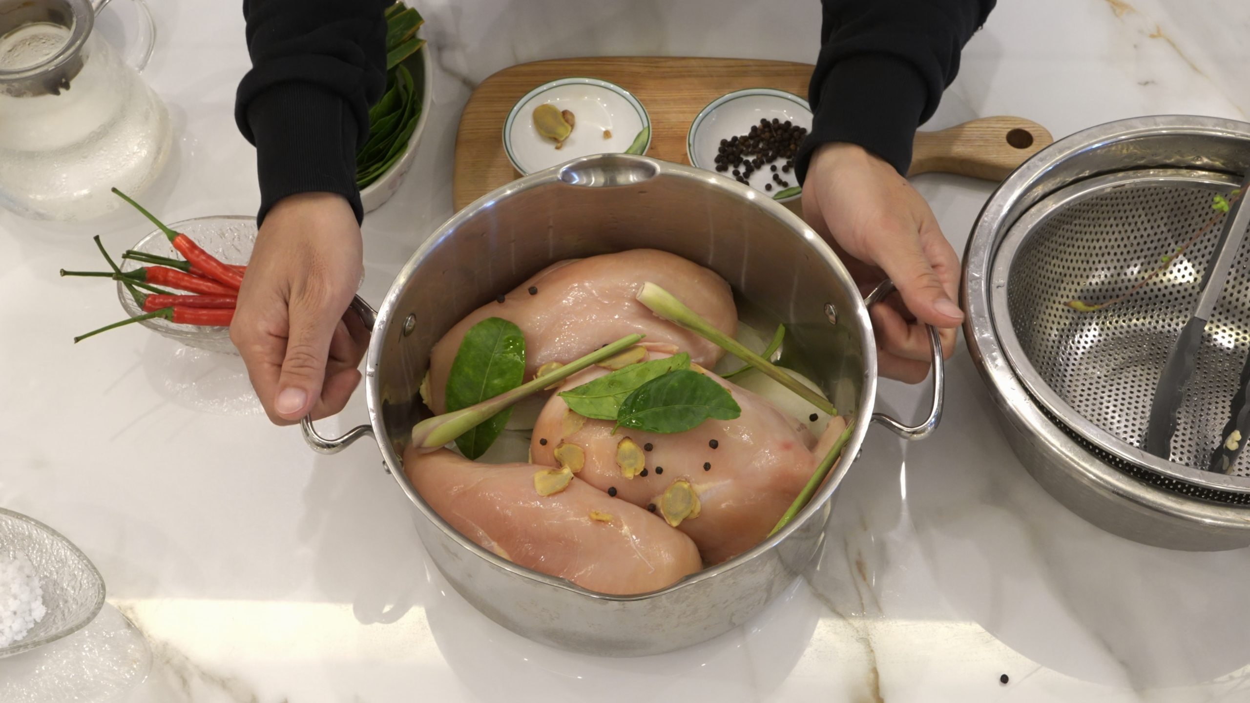 Boil the chicken with onion, lemongrass, ginger, pepper, lime leaves, and 100 ml water.