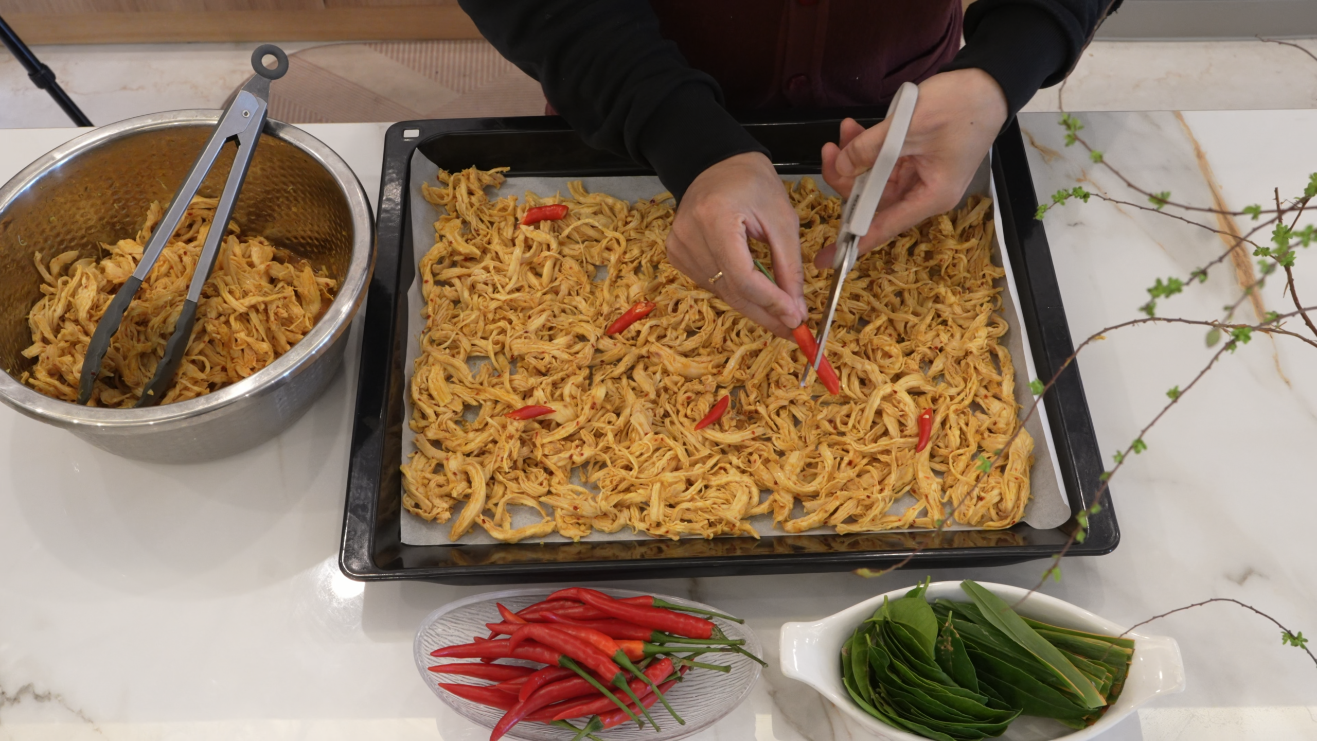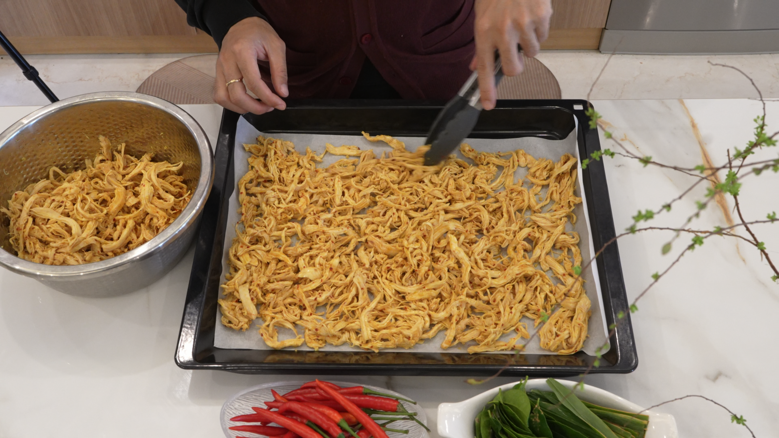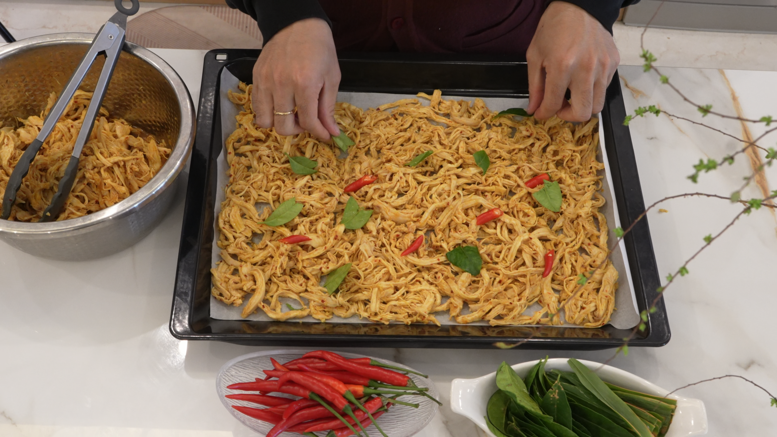 Đem ướp với thịt gà xé trong vòng 1 tiếng.