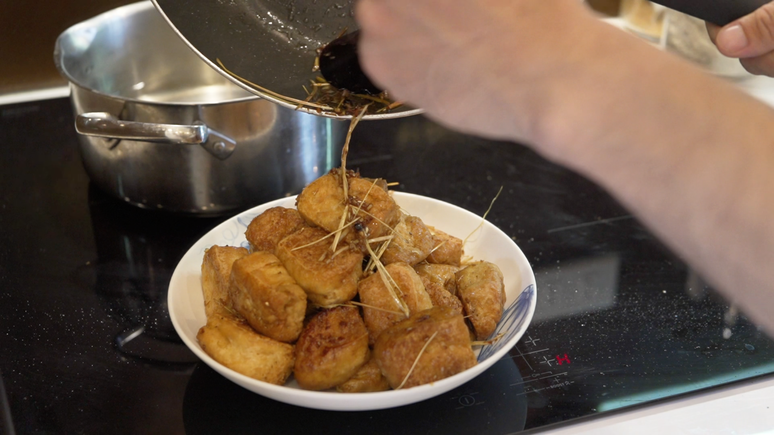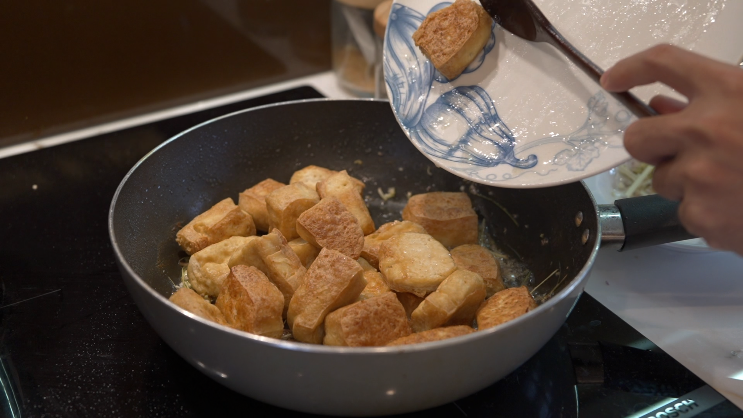 Pat the tofu dry, cut into bite-sized pieces, and fry until golden.