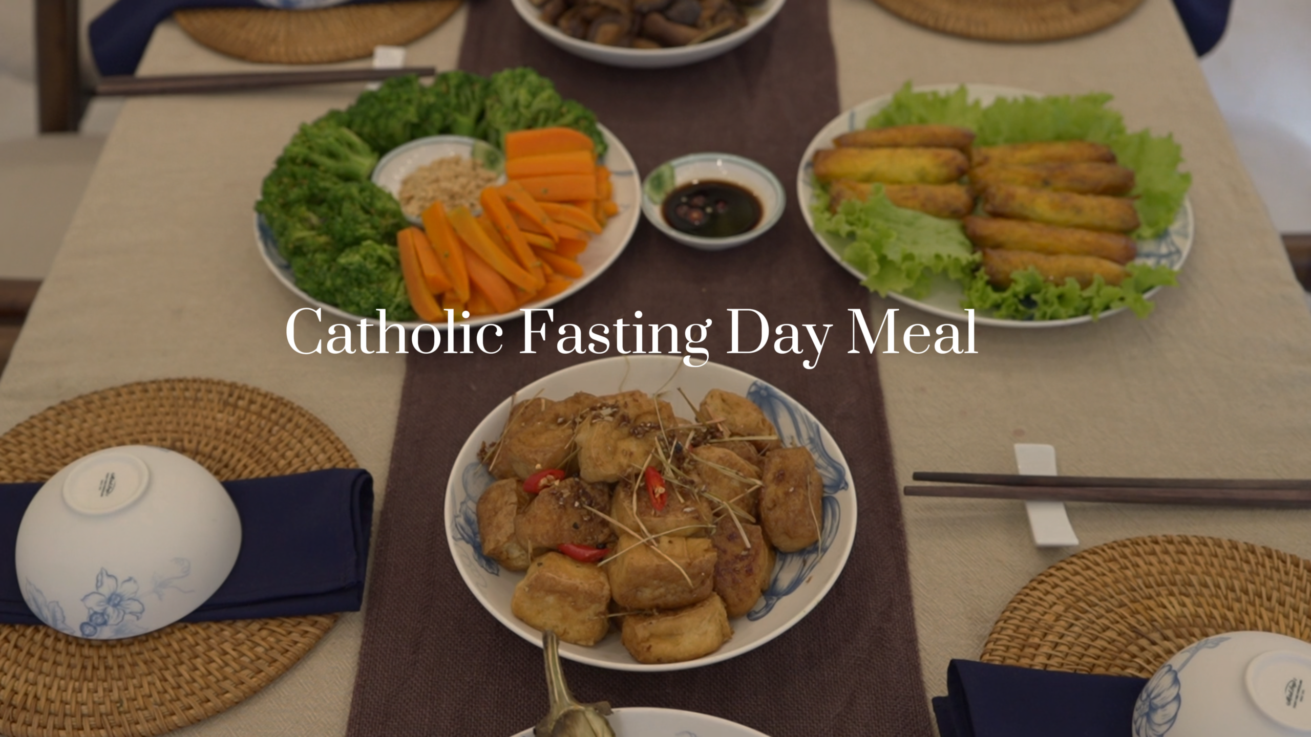 A simple Vietnamese vegetarian meal prepared on a Catholic day of fasting and prayer. These are some comforting plant-based dishes in Vietnam: fried tofu with lemongrass chili, stir-fried mushrooms, grilled eggplant with scallion oil, boiled vegetables with sesame salt and a warm bowl of rice.