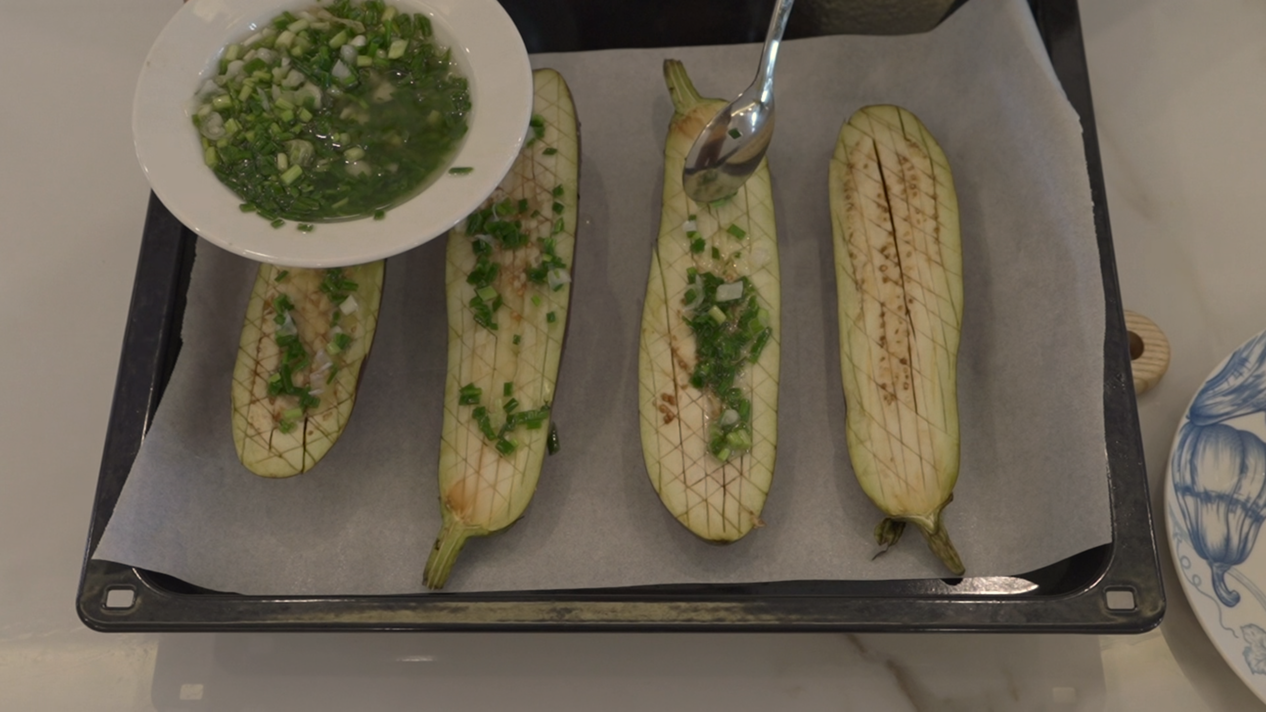Món thứ 3: Cà tím nướng mỡ hành | The 3rd dish: 🍆 Grilled Eggplant with scallion Oil