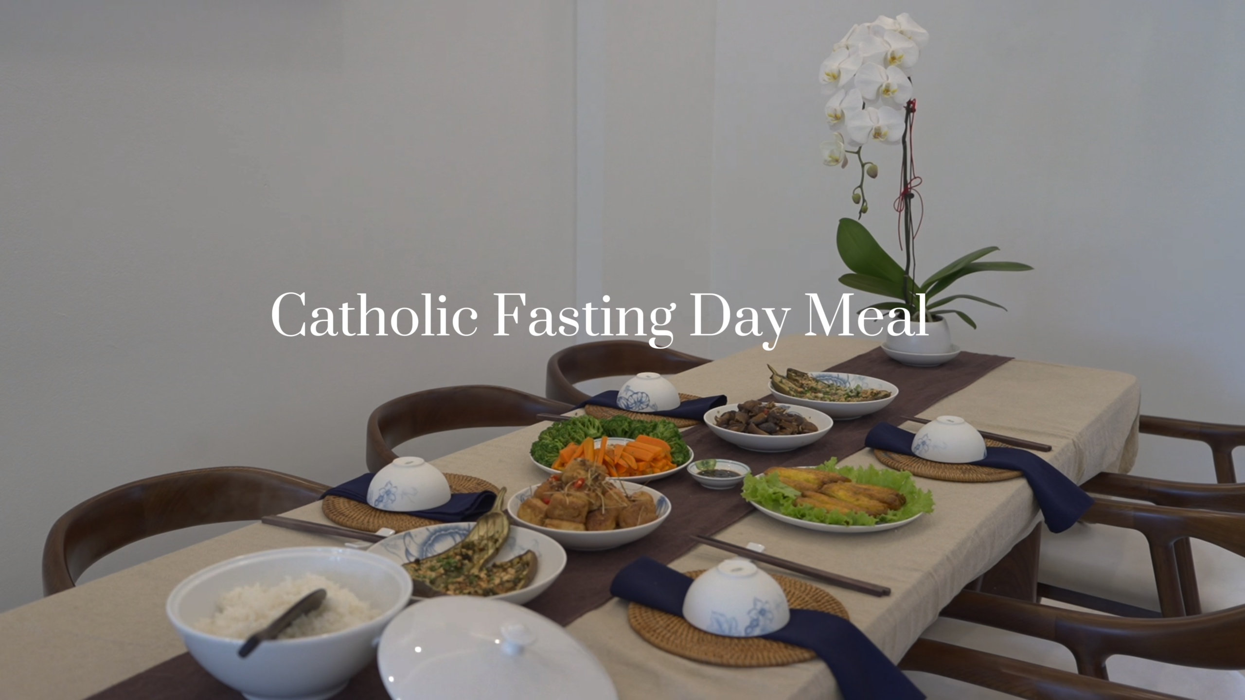 A simple Vietnamese vegetarian meal prepared on a Catholic day of fasting and prayer. These are some comforting plant-based dishes in Vietnam: fried tofu with lemongrass chili, stir-fried mushrooms, grilled eggplant with scallion oil, boiled vegetables with sesame salt and a warm bowl of rice.