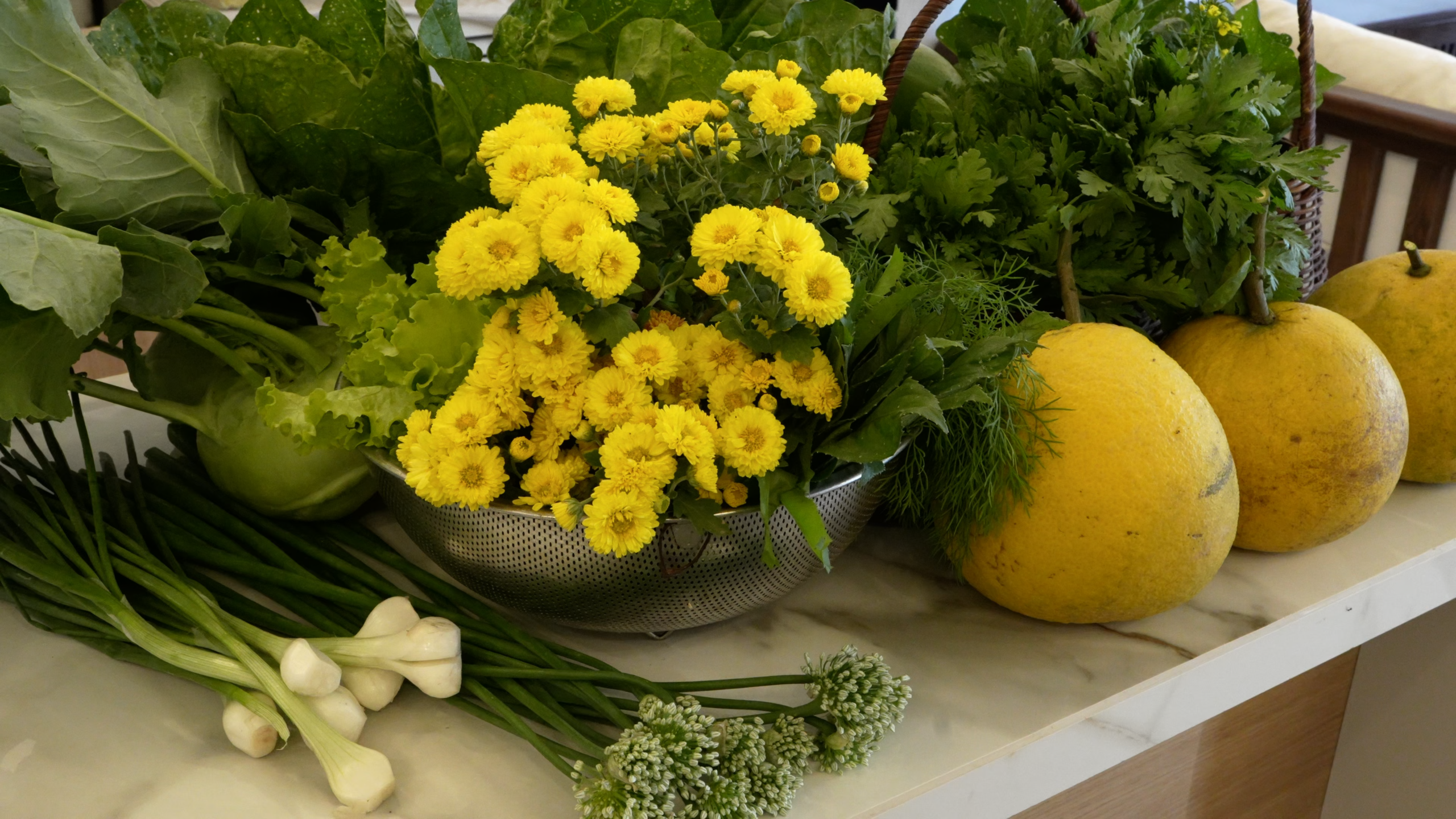 Today’s harvest includes mostly leafy greens: kohlrabi, napa cabbage, bok choy, lettuce, chrysanthemum greens… and herbs like dill, coriander, green onions, and mint… Cabbage, cauliflower, or garlic will be harvested in the coming days. There are also papaya and pomelo in the garden. I harvest daisy to use both for flower vase and for drying to make tea.