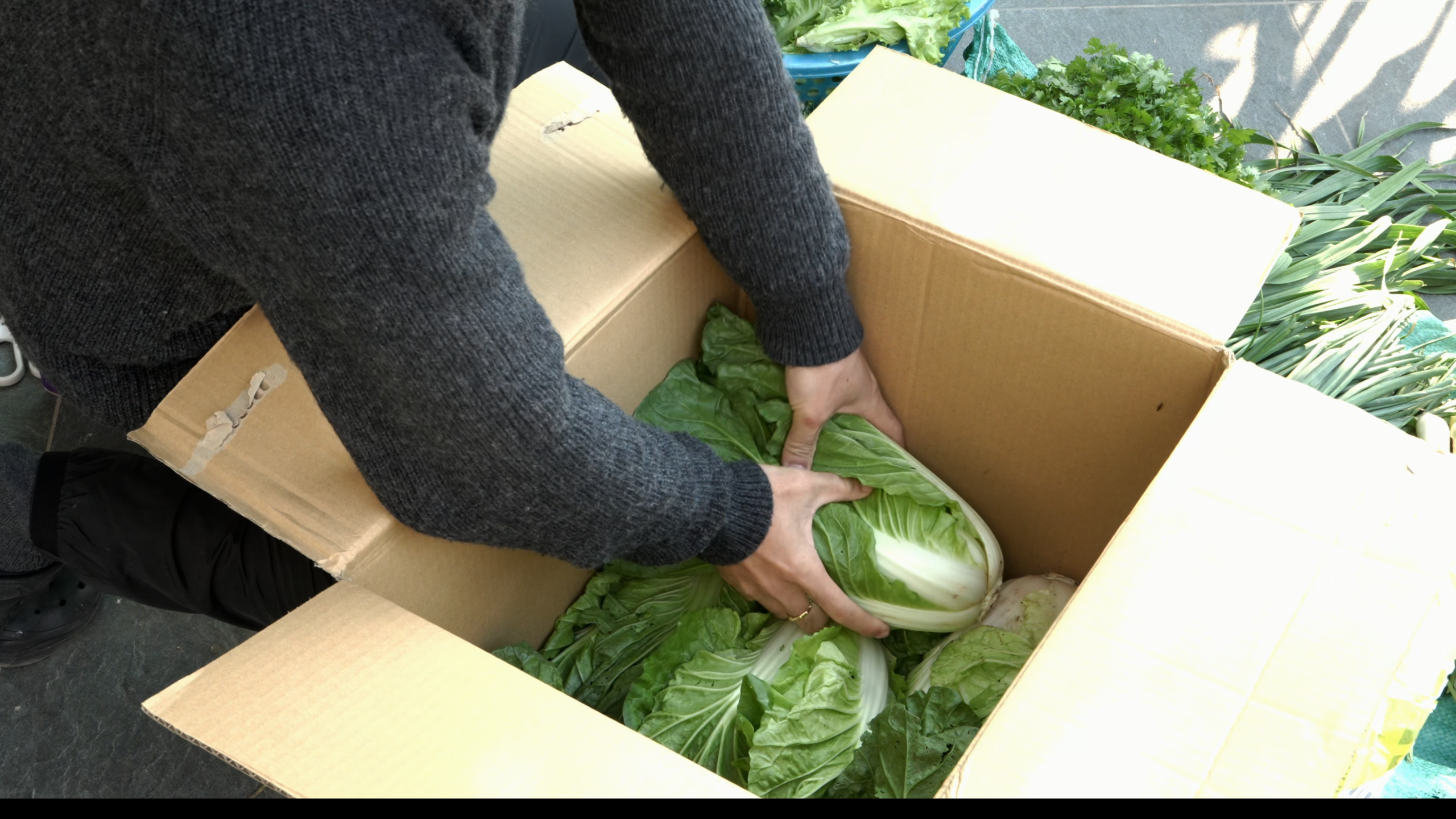 My parents gather vegetables so I can pack them and send them to my brother’s family. Like simple gifts from the countryside – fresh and wholesome, saved carrying a small piece of home.