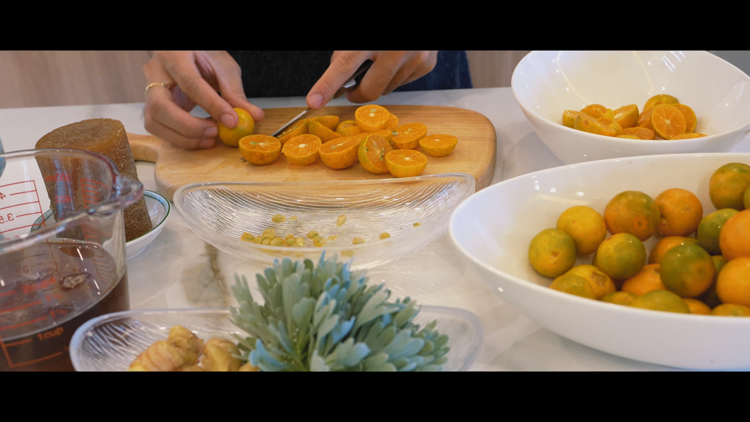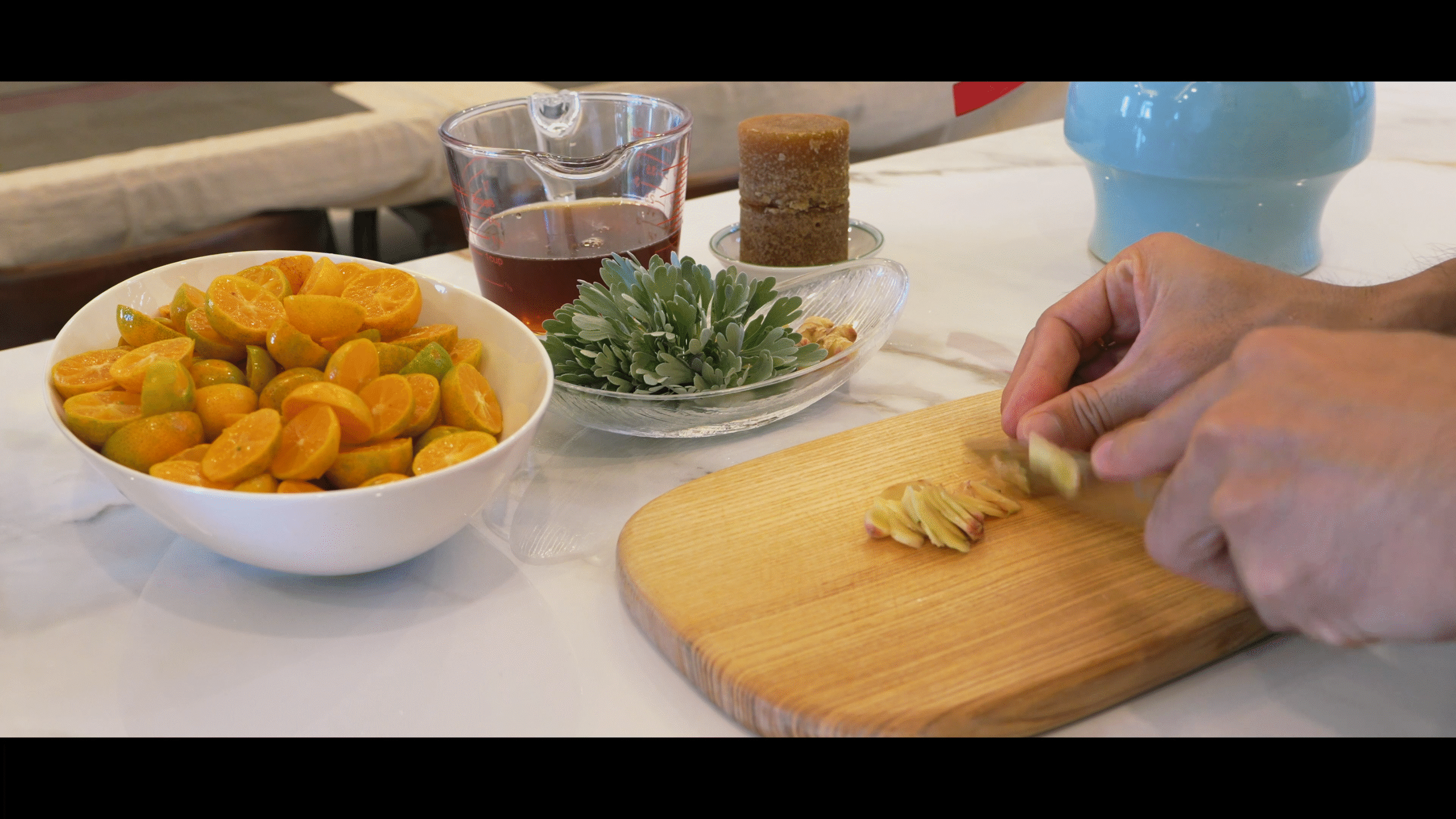 Nguyên liệu: 700gr quất, 30gr gừng, 250gr đường thốt nốt, 250ml mật ong, lá cúc mốc hoặc có thể thay húng chanh hoặc cánh hoa hồng trắng.