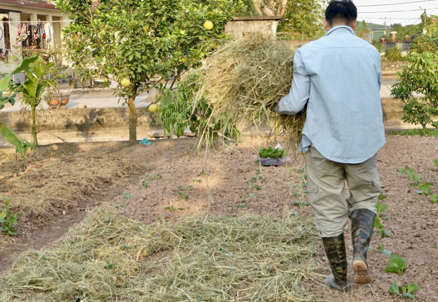 Mỗi công đoạn đều thủ công từng chút một. Cẩn thận cấy từng cây non ngay hàng thẳng lối. Rồi phủ rơm như đắp chăn cho cây những giấc ngủ xanh non, tưới nước cho cây. Và còn bao ngày chăm bón chờ cây lớn lên. Tôi sẽ update tình hình phát triển của khu vườn nhà.