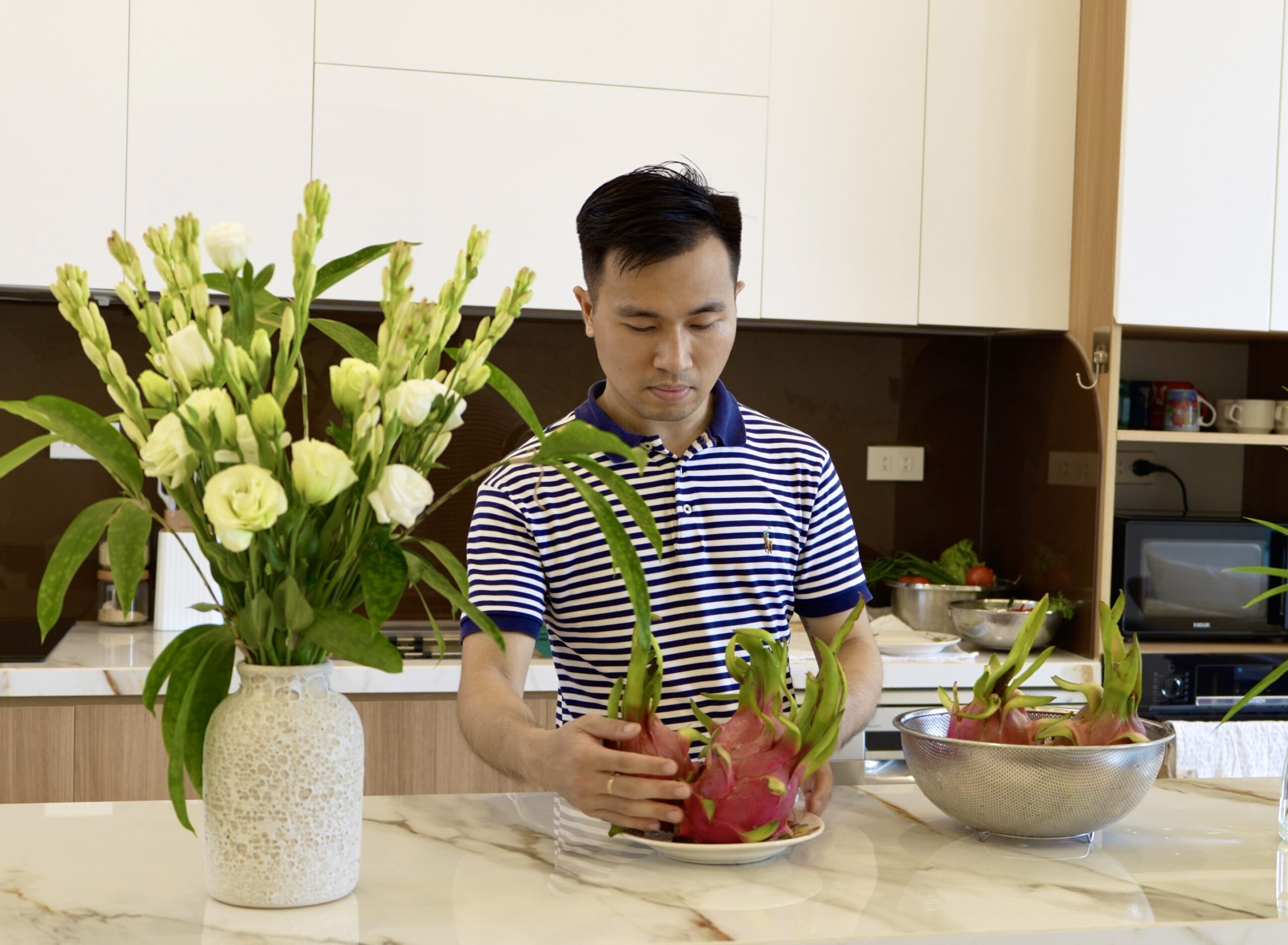 Sắp đặt trái thanh long và bình hoa huệ để mang lên ngôi nhà của bố mẹ – nơi có bàn thờ để kính nhớ ông bà tổ tiên, có chút hương hoa thơm, trái ngọt cùng thắp lên nén hương trầm và hơn hết là tấm lòng thành.